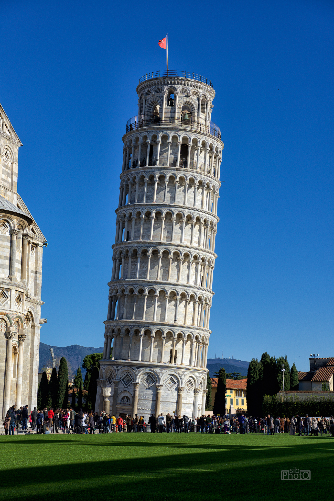 We’ve both been fascinated by the famous Leaning Tower (Torre Pendente) since childhood and it turns out that it’s still there and still leaning (and still crowded – apparently other people are also fascinated!) The lean was reduced and stabilized through remedial work in the 1990’s from 5.5′ to about 4′. It still looks pretty crooked…