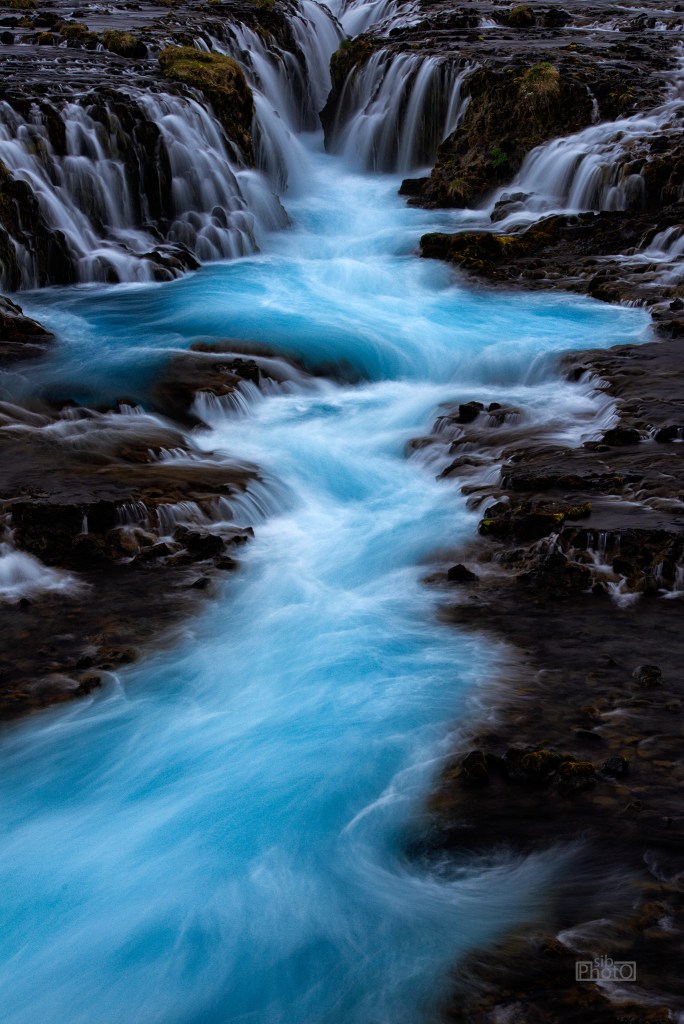 In a country of thousands of waterfalls, Bruarfoss stands out as one of the most remarkable. It is named after a stone bridge that used to cross the river but fell many years ago. The water, melting from the Langjökull glacier, is extremely blue; we visited the falls at about midnight on the summer solstice and the light and colors were spectacular.