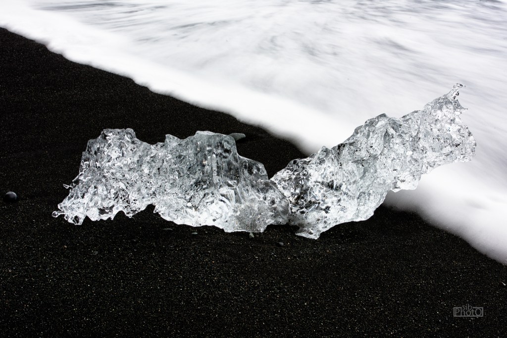 On the southeast corner of Iceland, near the Jökulsárlón lagoon, lies Breiðamerkursandur beach. As the tide flows in and out of the lagoon, and the icebergs melt and break apart, small bergs flow out into the ocean and are occasionally pushed back onto the beach by the waves and tides.