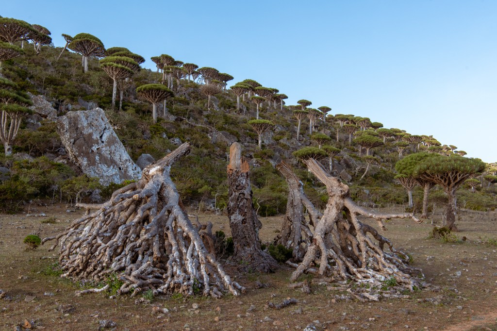 These very strange trees, Dracaena cinnabari, are endemic to Socotra and found in only two areas, the Firhmin Forest and the Homhil Valley. We were able to camp in both locations during our stay in Socotra. While their lifecycle is not fully understood, they live for hundreds of years and grow extremely slowly to more than 30 feet tall; although there are tens of thousands of the trees, they are threatened because the domestic goats eat the young trees, so they are not being replaced as they die.