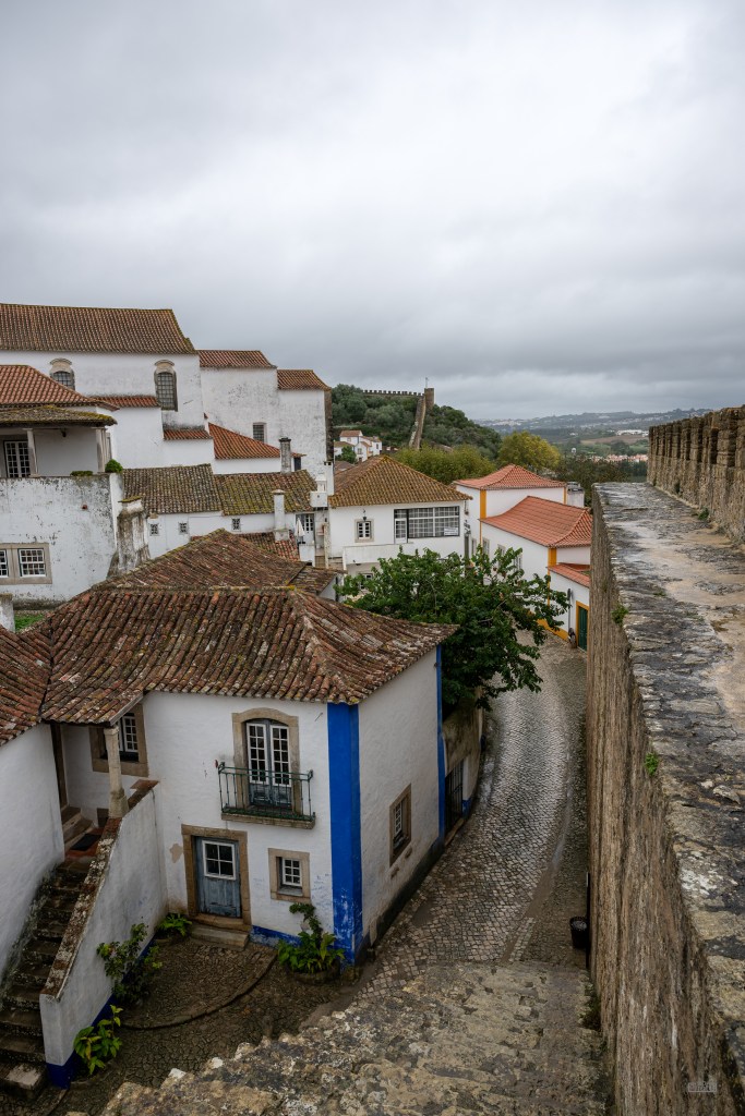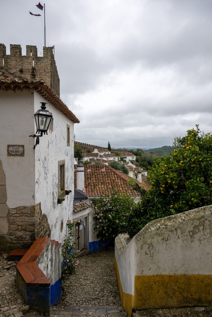 Óbidos is a small (~3,100 inhabitants) ancient walled town near the central coast of Portugal. There was a Roman settlement on the hilltop, and later the Moors built fortifications there. In the 12th century, the first king of Portugal took the area back from the Moors. Today, it is a tourist destination, with well-preserved squares, streets, and walls painted white with blue and yellow-orange accents.