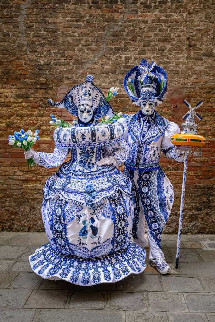 We learned that the Masks spend months, sometimes years, conceptualizing, designing, and hand-crafting their costumes. Many have been participating for decades. The most elaborate getups can weigh 40-50 pounds. They wear these creations all day long, navigating narrow alleys and tiny bridges, often in heels. The dedication is astounding.